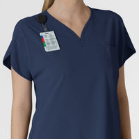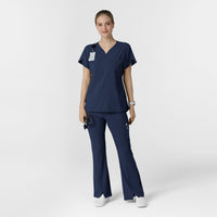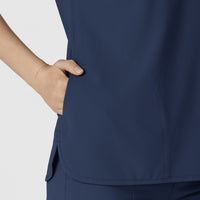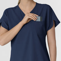 A Y-neck and dolman sleeves with binding details give this women's scrub top a sophisticated silhouette. It's made of a polyester blend that includes recycled materials for a lighter tread on planet Earth. Plus it's stretchy and easy to move in, so you won't spend a minute of your shift thinking about your clothes. There's a loop for your badge on the shoulder, and multiple pockets for your cards, pens and phone.